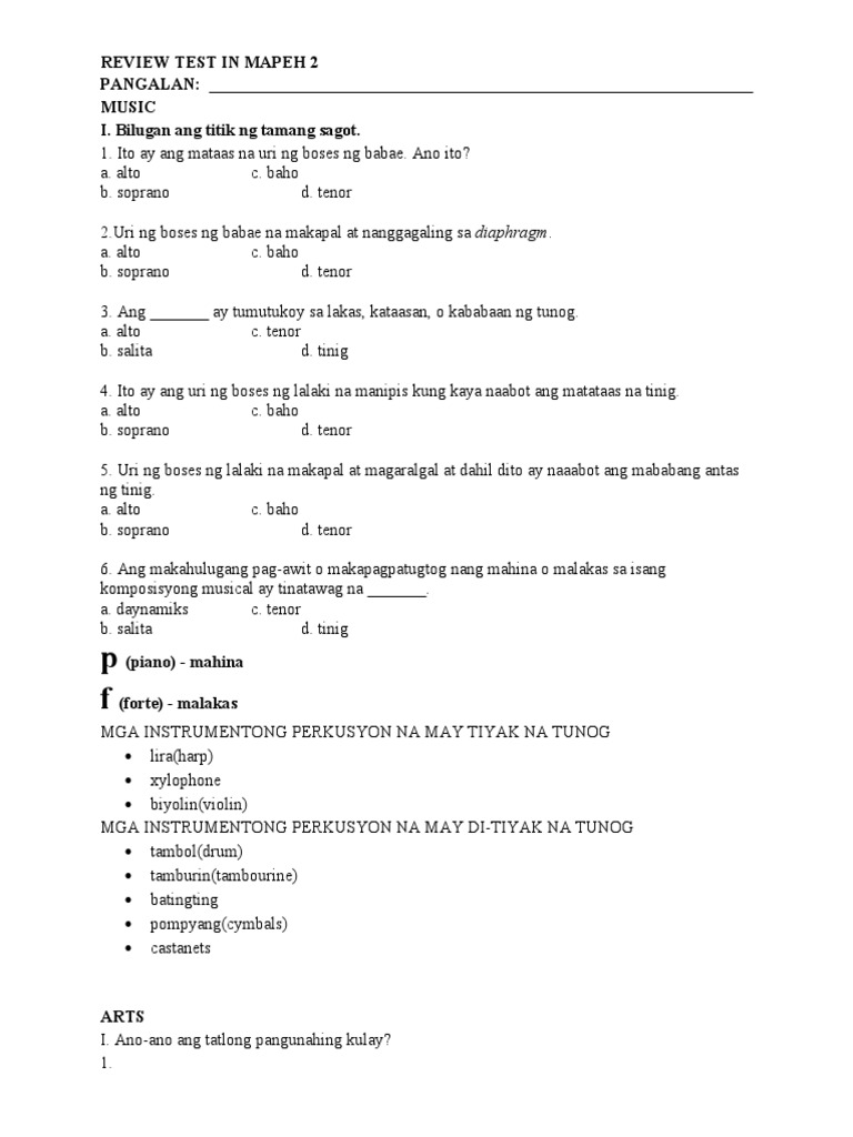 Anu ano ang ibat ibang uri ng katutubong instrument. Ito ay mabisang paraan para bumalik ang boses. Anong lyrics o parte sa Iskor ng awit ang may papahina o papalakas na boses habang ito ay inyong pinakikinggan.