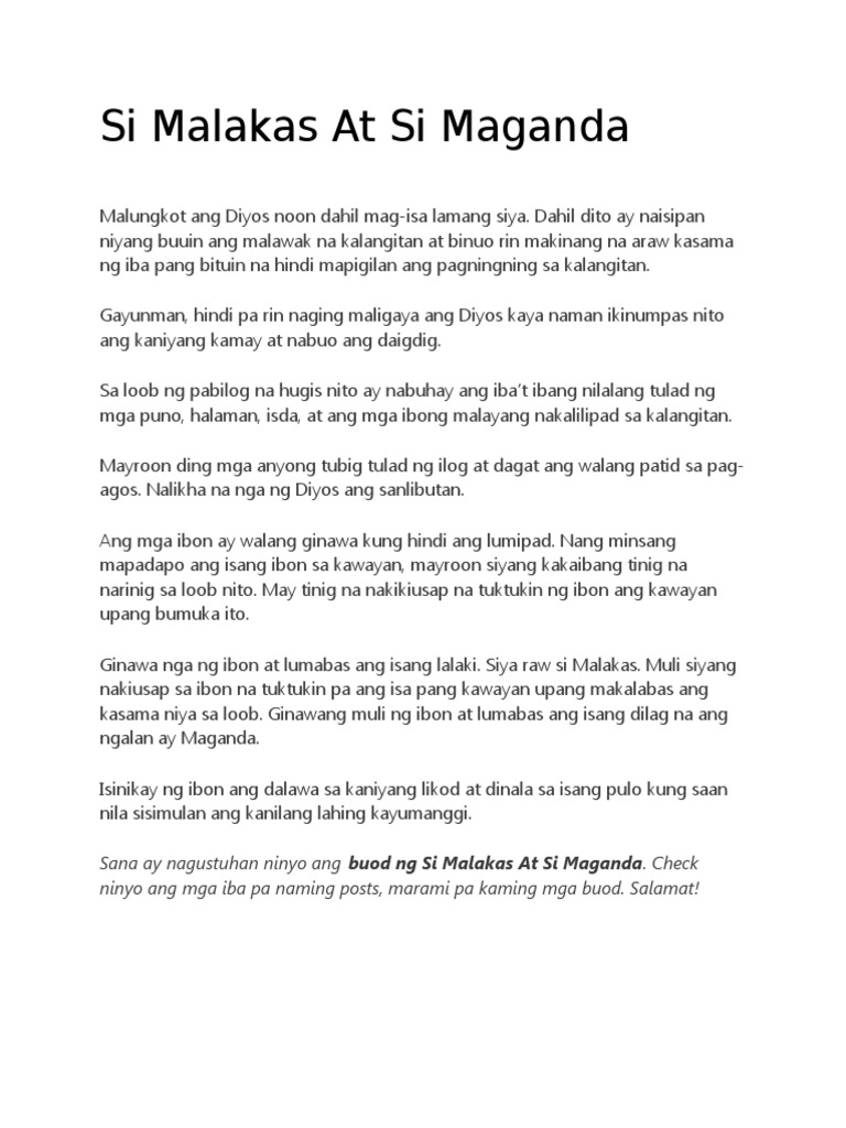 Si Malakas at si Maganda Ang Alamat ng Unang Pilipino Ang kwento o istorya ng pinagmulan ng lahing kayumanggi Pinoy Stories Kwentong May Aral Tagalog. SI MALAKAS AT SI MAGANDA KUWENTONG-BAYAN Bago nagsimula ang panahon ang daigdig ay isang malaking kawalan. The sun rose bright as a gold and the heavens were embellished with clear blue skies.
